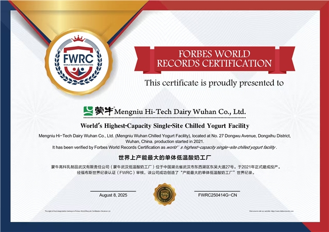 发布会上,FWRC福布斯世界纪录认证官本·科特正式宣布蒙牛低温武汉工厂荣获“世界上产能最大的单体低温酸奶工厂”认证,并现场颁发证书。该项权威认证不仅是对其世界级规模与智能化水平的充分肯定,更是中国乳业以创新驱动发展、引领新质生产力建设的里程碑式成就。