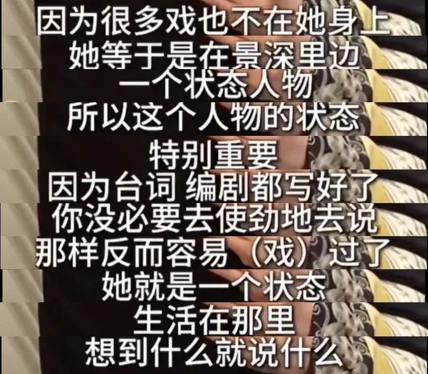 揣摩完角色,迟蓬聊自己表演的心得时,又提到大脚娘是在景深里边的一个人物,所以她的状态特别重要,没必要使劲说台词显得戏过,表现得她就像生活在那里,想到什么就说什么一样就好。