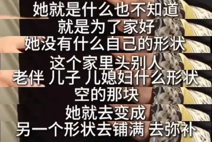 她说,大脚娘没有自己的形状,这个家里头老伴、儿子、儿媳妇的形状拼完后,空的那块形状,她就补上去,去铺满。